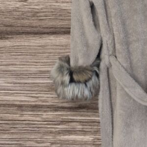 Wrap yourself in our women's luxury robe, featuring our signature oversized hood with ears, in a grey and tan animal-inspired faux fur trim, paired with a plush grey double-sided extra cozy body fabric, making for an unbeatable ultra-soft feel. Our luxury bathrobes are crafted from premium OEKO-Tex-certified, cruelty-free, animal-friendly, skin-safe materials.