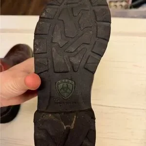 Stylish Ariat ankle boots. Red upper with intricate stitching. Durable brown leather foot. Perfect for casual wear.