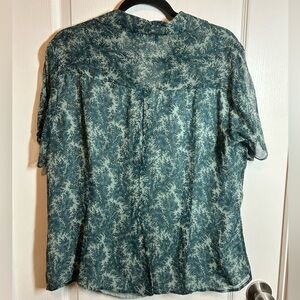 Chic teal button down with intricate pattern. Short sleeves and lightweight fabric. Perfect for casual or dressy looks.