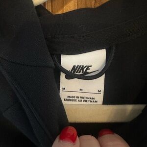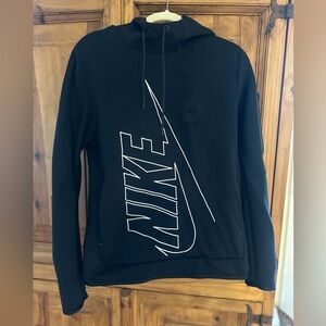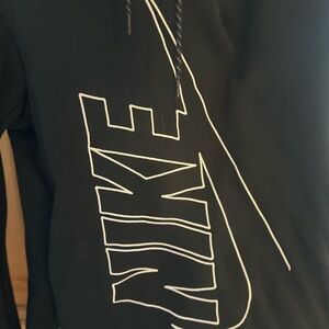 Sleek black Nike hoodie featuring a bold white outlined Nike logo graphic for a modern, sporty look. Soft and comfortable with an athletic fit, adjustable drawstring hood, and long sleeves—perfect for workouts, casual wear, or athleisure styling.