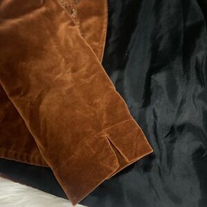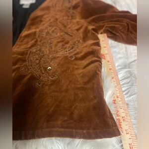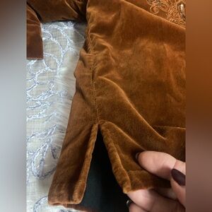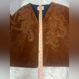 Luxurious velvet blazer featuring detailed paisley embroidered stitching with copper sequins, collarless, open front, and slits on sides and sleeves. Ideal for a chic, sophisticated look whether you’re wearing jeans or slacks.