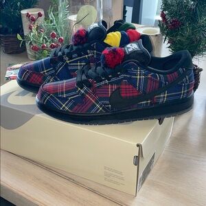 Nike SB plaid Nardwuar dunk lows. Brand New in box. Perfect new condition. Comes with five variations of laces- black, red, navy, green, gold, and a little detachable puffball. Brand new deadstock - never worn. Barely handled.