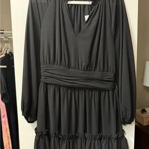 This chic black dress features elegant long sleeves and a flattering silhouette. Perfect for any occasion, it combines style and comfort effortlessly.