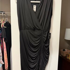 New with tags! Chic black dress with an asymmetrical drape. Perfect for elegant occasions. Flattering and stylish.