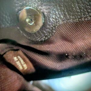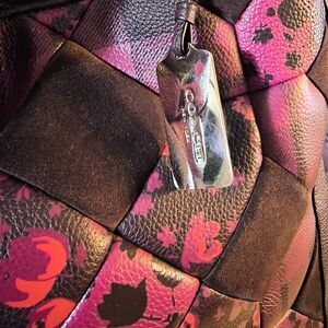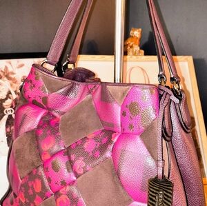 3 compartment. Turn lock middle compartment. Metal hangtag. Like new. Mixed leathers. Mixed purples and brown oxblood