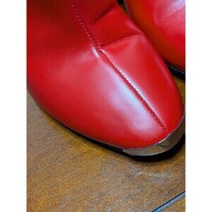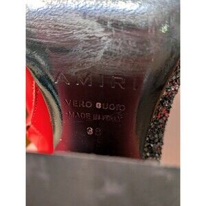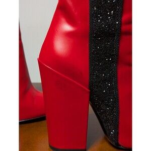 Elevate your footwear collection with these stunning AMIRI red leather ankle boots. Expertly crafted in Italy, these boots feature a bold, vibrant red leather upper contrasted by a shimmering black glitter vertical stripe on the outer side. The sleek pointed toe is finished with a polished metal hardware detail for an edgy, high-fashion look. These retail over $700!