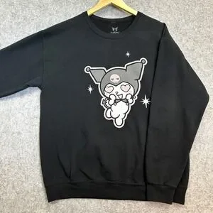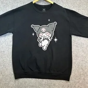 Get cozy and cute in this pre-owned officially licensed Kuromi™ by Sanrio fleece-lined crewneck sweatshirt. Featuring Kuromi in an adorable pose with heart eyes on the front and a large pink sparkle kull heart graphic on the back, this piece is perfect for fans of Sanrio, Kawaii fashion, or character streetwear. Soft and warm with a brushed fleece interior, it's ideal for layering during chilly seasons or lounging in style.