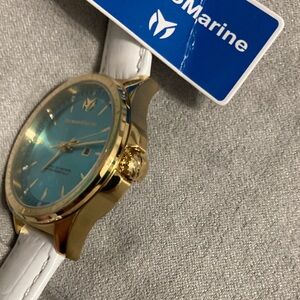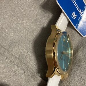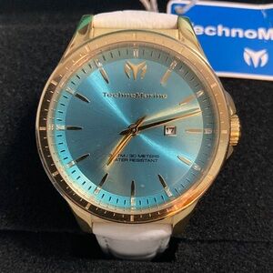 Stylish Technomarine smartwatch with a vibrant blue dial. Features a luxurious gold case. Perfect for modern wear.