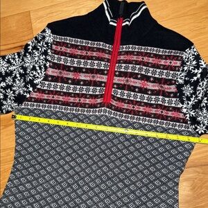 Stylish sweater with snowflake and geometric patterns. Features a red zipper and a mix of black and white designs.