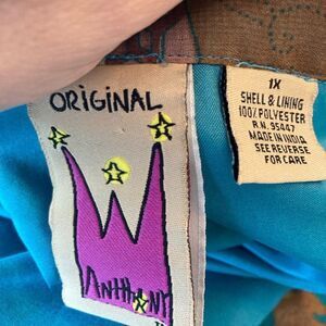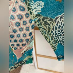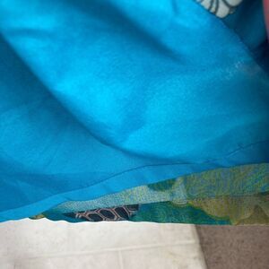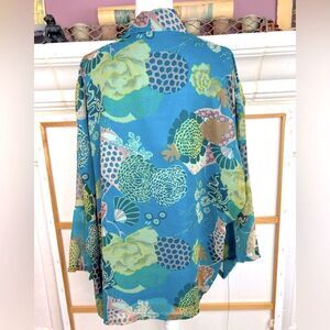 Absolutely stunning and original lined kimono from the legendary Anthony. Gorgeous colors large floral. Full real kimono style sleeves. I’ve never seen anything this beautiful. Open no fastenings. Pretty lapels. If you see another let me know! Very loose and glowing. Great with many colors and over a head to toe neutral look. NOT a cape but didn’t know what to call it. Has sleeves. Pit to pit 25-28” shoulder to hem 30”. Evening, lounge, cruisewear.