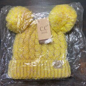 Adorable C.C. Kids knit beanie featuring a soft marled yellow/cream knit and double pom pom “ear” design. Cozy, stretchy, and perfect for chilly weather. Brand new with tags.