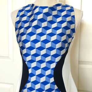 Antonio Berardi Vogue Runway Dress. Geometrical design on front with plain solid back. Full zipper on back, dress fully open. Knee length. Sleeveless, sheath dress. Color block detail. Cowneck. 70% Polyester/ 30%Silk.
