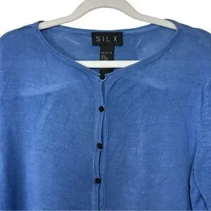 Preowned good condition. PLEASE SEE PHOTOS for measurements. The Silx Long Sleeve Silk Button Front Cardigan in light blue is a stylish and versatile piece perfect for both casual and business occasions. Made from tight-knit silk fabric, this cardigan features a round neck, long sleeves with button accents, and a slim fit design. The button accent at the hem adds a touch of sophistication to this classic and timeless cardigan. Pair it with your favorite outfit for a chic and elegant look this winter and fall season.