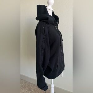 Stylish black hooded jacket. Features zip closure and unique sleeve design. There’s a tie detail on sleeves that you can tighten or loosen depending on the look your wanting
