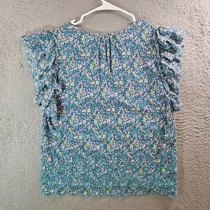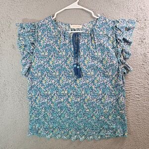 Solitaire Embroidered Top Blouse Women XL Floral Ruffle Cap Sleeve Green Yellow