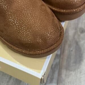 in a tan-brown finish with a faux-fur cuff and gold-tone MK medallion logo