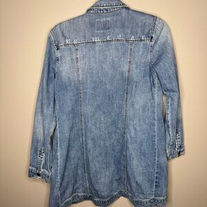 Classic denim jacket with button closure. Features chest pockets.