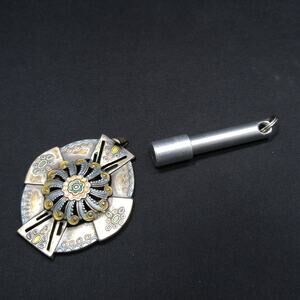 This is a beautiful vintage Art Deco brass enamel belt buckle dating from the 1930s, originally worn on a woman’s dress or belt sash. The design showcases an intricate geometric pattern with a floral center surrounded by scrolling feather-like shapes, giving the piece both symmetry and movement — hallmarks of Deco-era design.