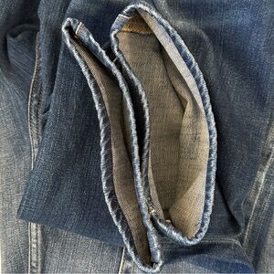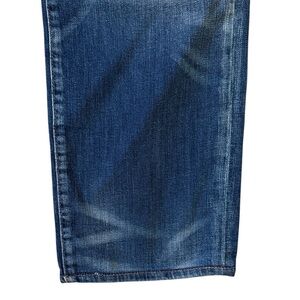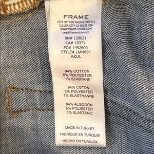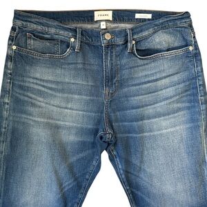 Frame Denim L’Homme Slim Fit Jeans. Straight Leg 5-Pocket Style. Dark Blue Wash with Feathering and Vintage-Inspired Fade. Style #LMH691 AZUL. 94% Cotton with comfort stretch. Mid-Rise. Made in Turkey.