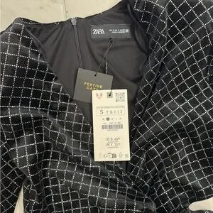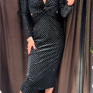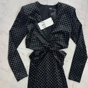 The product is a new Zara black shimmery velvet long dress in size small, with a midi length with waist cutout detail. This stylish dress features a V-neckline, long sleeves, and a bodycon style. Made of polyester velvet fabric, it exudes elegance and sophistication, perfect for various occasions. From Zara’s holiday collection size small new with tags
