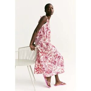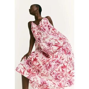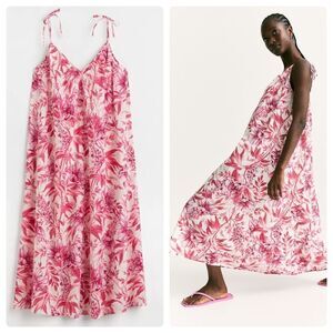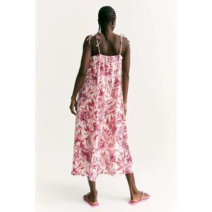 Calf-length, A-line dress in softly draped cotton voile. Narrow, tie-top shoulder straps, V-neck, and elastic at back. Unlined.
