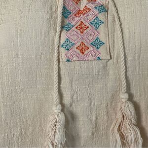 Beige Tassel Drawstring Boho Chic Embroidered Half Sleeve V Neck Top Size M