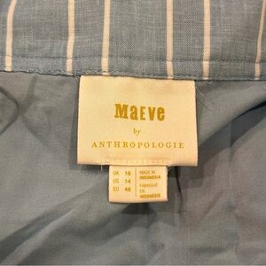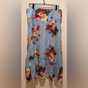 Maeve by Anthropologie Claudette Midi Linen Skirt - Baby Light Blue with White Stripes and Colorful Flowers - Women’s Size 14 - made of 45% linen - flounced, curved hem - button front - great condition - pre-owned. See photos for tags, condition and approximate measurements (to confirm fit).