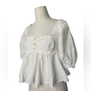 Excellent Used condition, no flaws So sweet in a cropped, babydoll-inspired silhouette, this goes-with-anything top features exaggerated sleeves and pleating at bottom for added shape and dimension, Boxy, slightly cropped fit, Square neckline, exaggerated sleeves, button-front detail, pleating at bottom.