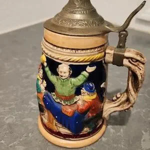 This vintage ceramic beer stein features a detailed design with a metallic lid. Perfect for adding a touch of classic charm to your home decor.