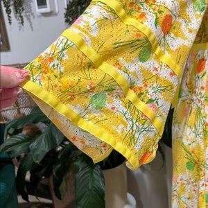 Step out in style with this elegant yellow floral maxi dress. Perfect for any occasion, this dress combines vibrant colors with a comfortable fit. Putting a modern day size medium. Bust measures 18 1/2 inches across. Empire waist with a tie back. Length from shoulder is 58 inches. Stunning in person.
