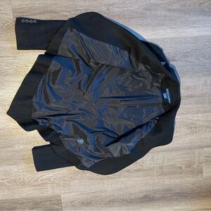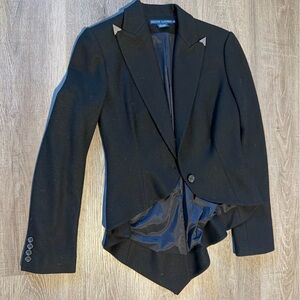 Chic black blazer with unique asymmetrical hem. Sharp lapels and single-button closure. Ideal for a polished look.