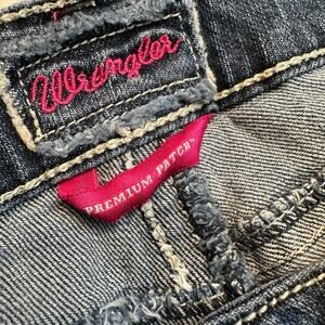 Wrangler Premier Patch Low Rise Boot Cut Denim Jeans. Medium wash denim. Five pocket styling. Cotton/spandex blend, some stretch. Intentional distressing and fading. Womens size 7/8 x 30. Good used condition.