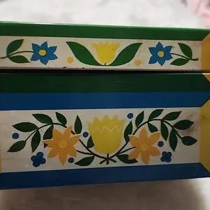 Charming decorative Metal box featuring a floral design. Blue and yellow flowers with green leaves adorn the box.