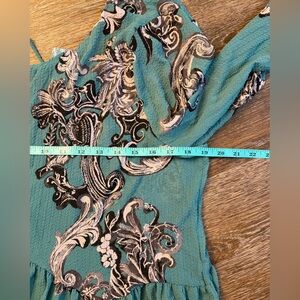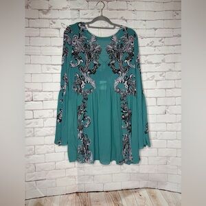 Beautiful Free People dress in a rich teal green with an eye-catching black, white & gray baroque-style print. Features a relaxed, flowy silhouette with soft pleating and long sleeves for that effortless boho vibe Free People is known for. Lightweight and comfortable—perfect for layering, everyday wear, or dressing up with boots or heels.