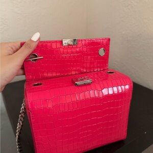 This chic mini bag is a vibrant pink with a croc-embossed texture. It has a sleek silver handle and chain strap.
