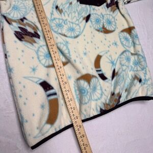 Patagonia Synchilla fleece pullover with a whimsical owl and dreamcatcher print. This cozy quarter-zip features a collared neckline and a kangaroo pocket. Perfect for casual outings, hiking adventures, or chilly evenings around a campfire.