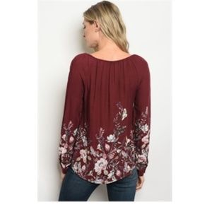 Brand new boutique top. Beautiful, fall floral pattern. Gorgeous burgundy color long sleeve with tie strings in the front.