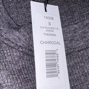This elegant charcoal color dress features a sophisticated design with long sleeves and a stylish side with ruching and side tie