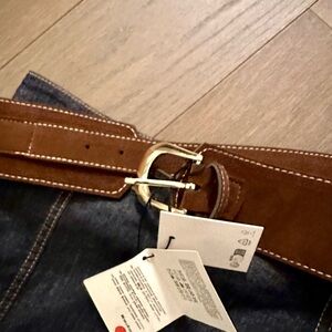 High-waisted denim skirt with suede belt and wrap front. Side zip with a concealed seam closure.