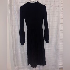 Classic and flattering black knit midi dress by Draper James RSVP. Features a mock neckline, long balloon sleeves with ribbed cuffs, and a beautifully textured diamond-knit skirt. The fitted top and gently flared skirt make this a timeless, versatile piece perfect for work, dinners, or special occasions.