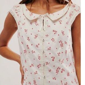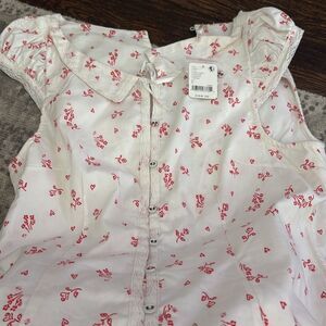 Features: Soft cotton fabrication, scoop-neckline with collar detail and functional tie, button-front detailing, drop-waist seam, keyhole cutout at back, cap-sleeves, lined.