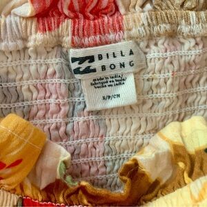 NWT. This vibrant Billabong blouse features a smocked bodice and charming puff sleeves, perfect for a stylish and comfortable look. The warm orange and yellow hues add a cheerful touch, while the ruffled details enhance its playful appeal. Ideal for sunny days, this top combines a retro-inspired design with modern flair. See photos for approximate measurements.