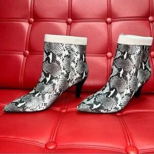 Great condition. The 42 Gold Olvy Snakeskin Suede Leather Point Toe Kitten Heel Bootie is a stylish women’s bootie known for its modern design and versatility. It features a snakeskin print on suede leather, a pointed toe, and a sleek, low kitten heel, making it a fashionable choice for both casual and dressy occasions.