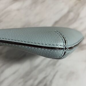 Kate Spade New York crossbody bag in a soft light blue pebbled leather with gold-tone hardware. Slim, structured silhouette with an exterior zip pocket and adjustable shoulder strap — easy everyday size.