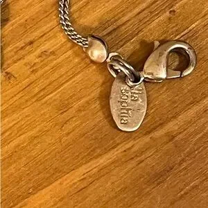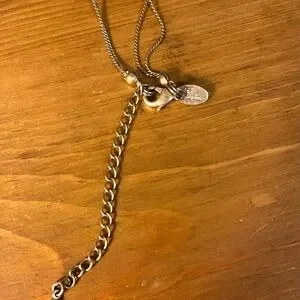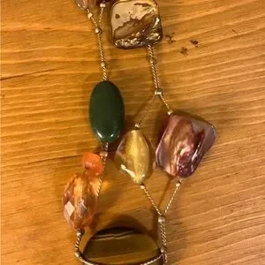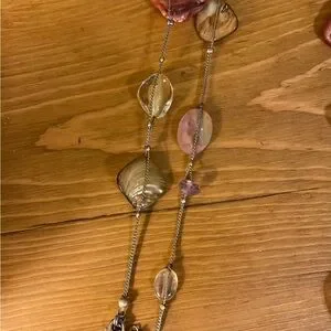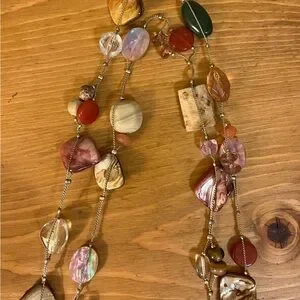 Gold tone chain is 39 inches with a lobster clasp and 3 inch extender. It has a tag that says, “Lia Sophia” and has different stones and shells. Tigers eye is featured at the bottom. It has mother of pearl, green, marble looking pink, and white marble looking stone. This necklace is long and can be easily doubled.
