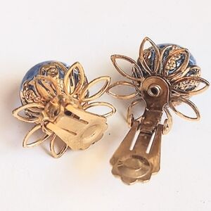 Set features sapphire blue crushed ice bubble beads in an intricate gold tone design with a flip clasp and measures 18" long. Matching clip on earrings measure 1.25" High end but unsigned. Please view pics closely for condition details and size comparisons. This is pre-owned vintage and does show very minor wear consistent with use, age and/or storage. Very good overall vintage condition.