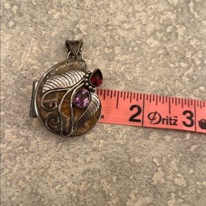 This exquisite silver pendant features stunning red and purple gemstones, perfect for adding a touch of elegance to any outfit.