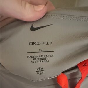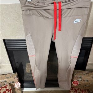 Nike Air Running Dri-FIT 7/8 leggings in a taupe or grey colorway with bright crimson (orange/red) accents. They are made with Nike's Dri-FIT technology, designed to help keep you dry and comfortable during runs or workouts.