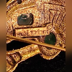 Celtic knotwork with green art glass stones featured on this vintage Sol D'or brooch