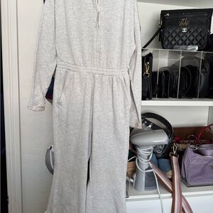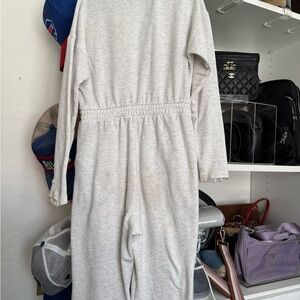 Soft and cozy one piece. Features a full front zipper. Perfect for everyday wear. There is some discoloration on the back of the sleeves. But it still has life left in it.